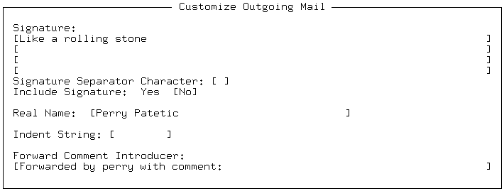 Your signature can be four lines long. Enter the signature information in the form's four ``Signature'' fields. Make it look just as you would like it to look at the bottom of your mail messages: