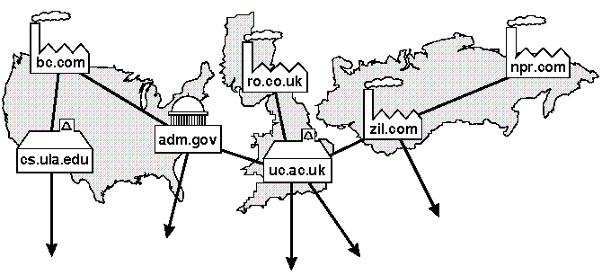 Each domain is divided into hierarchies of subdomains that may have an arbitrary number of levels. The lowest level subdomain is may be an individual computer name, an organization name, or the name of a division within an organization. Domains usually do not specify a machine name since this may very likely change; instead mail that arrives at an organization is redistributed locally between users on different host computers. When you receive a message from someone on a remote system, the domain of the sender appears to the right of the ``@'' character on the ``From'' line. For example: