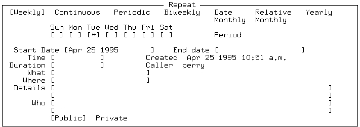 Select a time slot by selecting the desired line and pressing <Enter>, or by typing the first number of the selected time. If you want to schedule an event for a time in between those shown, press <F10>, and the Repeat form appears with the ``Time'' field blank for you to enter a time: