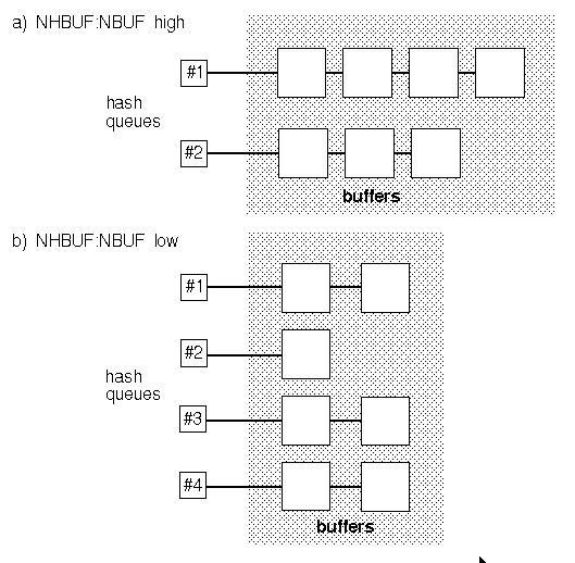 To speed look-up access, buffers are linked onto hash queues. The number of these is controlled by the NHBUF parameter. The average number of buffers per queue is the total number of buffers, NBUF, divided by the number of hash queues. The greater the number of hash queues, the fewer the number of buffers that will exist on any given hash queue on average.