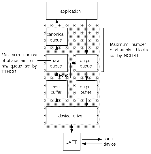 The operation of the terminal and serial device drivers for non-intelligent serial I/O cards is shown in ``Processing of input and output characters by the character list-based terminal driver''. Characters entered at a keyboard are received over a serial line and detected by the universal asynchronous receiver/transmitter (UART) on the serial card. On non-intelligent serial cards that use either a 8250 or a 16450 UART, a hardware interrupt is generated for every character that is received. The 16550 UART can buffer up to 16 characters and so does not generate as many interrupts per character.
