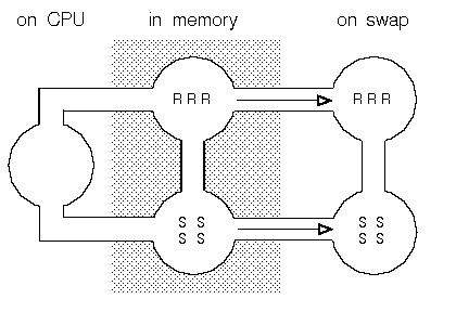 sched checks for processes that are either waiting for an event to complete or that have been stopped by a signal. If a process has been in either of the two states for more than 2 seconds, sched moves it from memory to the swap area, and adds the reclaimed pages to the free list. If enough memory is still not available, and sched fails to find another process that is sleeping or stopped, it attempts to swap out processes that have been on the run queue or waiting for memory longer than two seconds. ``The swapper daemon swaps out processes'' shows how sched can swap out processes in a system.