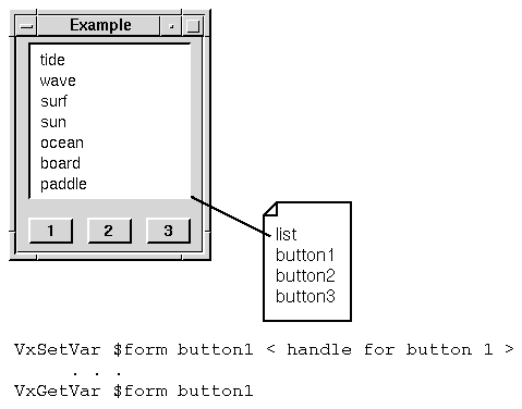 Generally, VxSetVar(VTCL) is used to conceptually attach a named string to a widget. In this case, the widget is the form, the name of the data is the name of the button and the data string is the button widget handle. In this example, we specify the handle of the form ($form), the name of the widget we are attaching (button1) and the widget's handle.