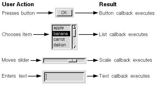 Responses to events are called ``callbacks'', and each callback has an associated procedure. This procedure is called each time the associated event occurs. For example, if you wrote a callback for a pushButton widget, it would be called each time the button was pressed. This graphic illustrates several other callback routines: