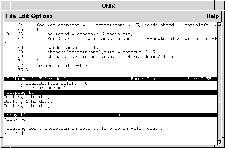 When invoked in screen mode (for example, without -s), the terminal display is initially partitioned into two windows -- a program source window with C/C++ execution and browse capabilities, and an interaction window. It is possible to create a number of other windows to segregate the information to a greater extent. For example, ``Sample dbxtra session'' contains an example of a dbxtra screen with a number of the windows described above.