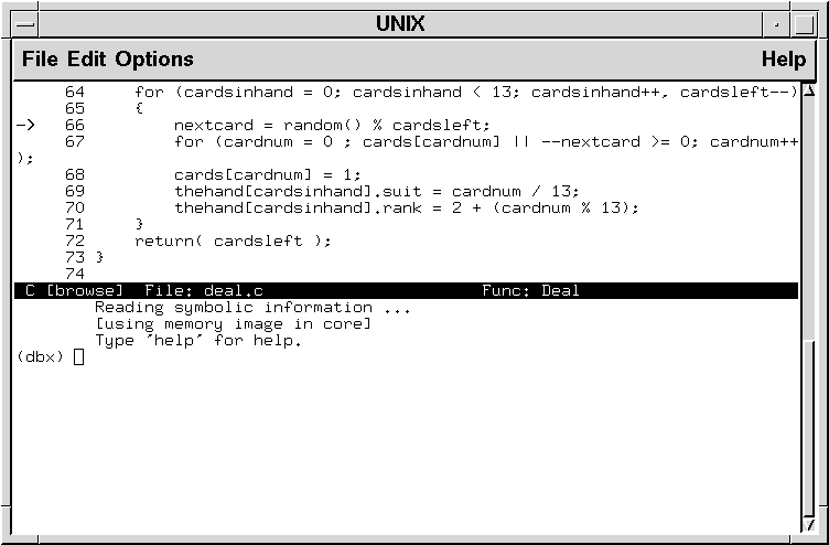 The figure below resembles a window with two panes separated by a narrow horizontal bar. The top pane contains lines of C code from the source file deal.c, and an arrow is pointing at line 66 where the illegal instruction that caused the core dump is located. The horizontal bar identifies the file (deal.c) and the function name (Deal). This bar constantly displays the name of the active function and the source file in which it appears.